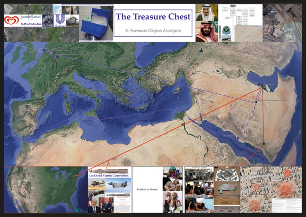Forensic Object Analysis is a counter cartography and visual inquiry of a polymer object (Treasure Chest) which was found in May, 2017 on Scheveningen Beach. The object itself is caught in complex systems & logistics which indirectly risk funding likely war crimes and verified human rights violations in Yemen. Therefore, a more indepthiness analysis is required. Forensic Object Analysis is the current product and result of this analysis and visual inquiry.